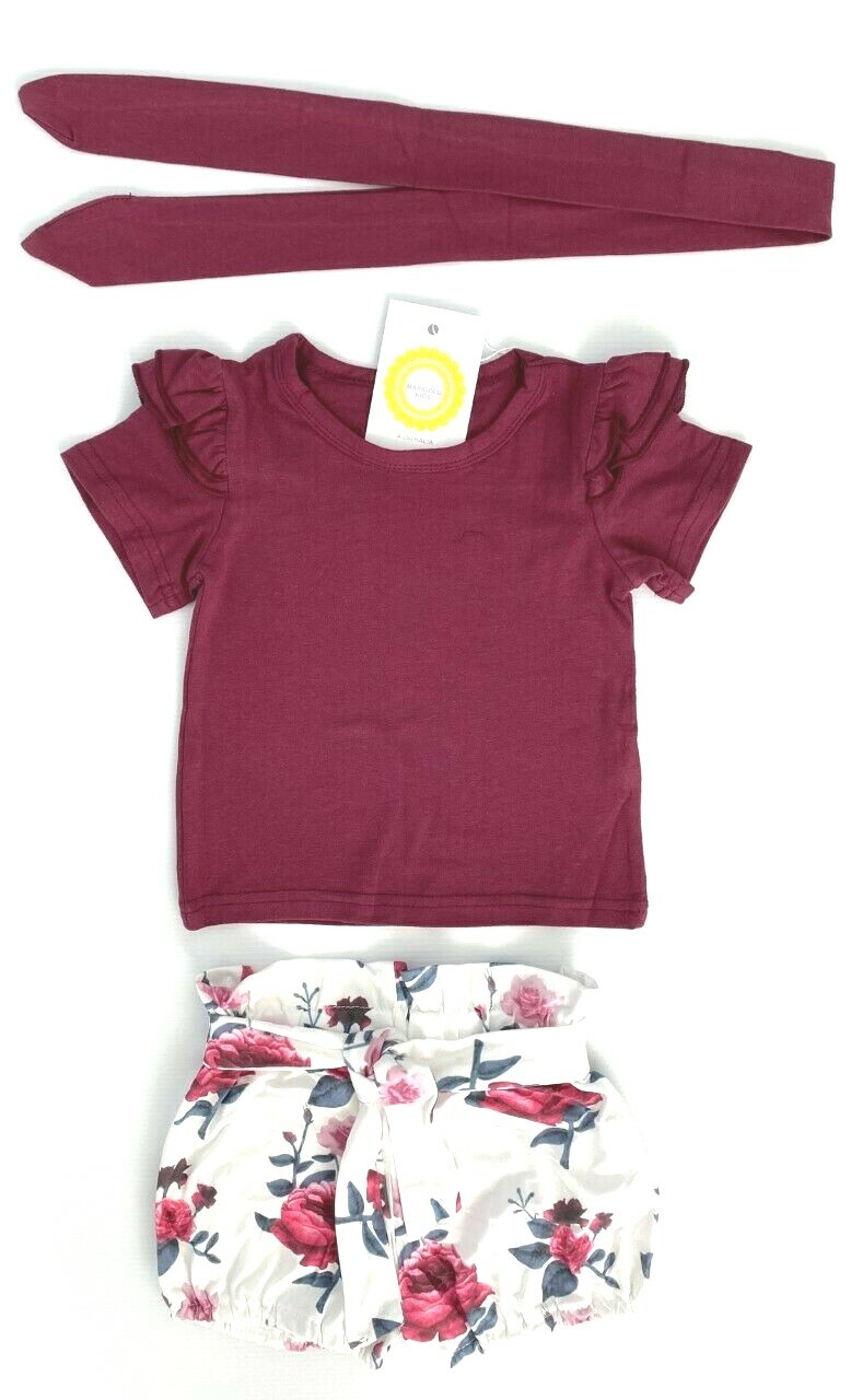NEW Size 0-3 months/ 3-6 months / 9-12 months / 12-18 months Baby Girls Burgundy Red Rose Outfit, Burgundy Red Ruffle Sleeve Top, Rose print Shorts and Tie-up Headband 3 Piece Set -Please Select Size