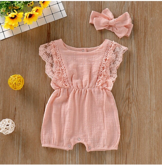 Coral Pink Lace Trim Baby Romper & Headband Set