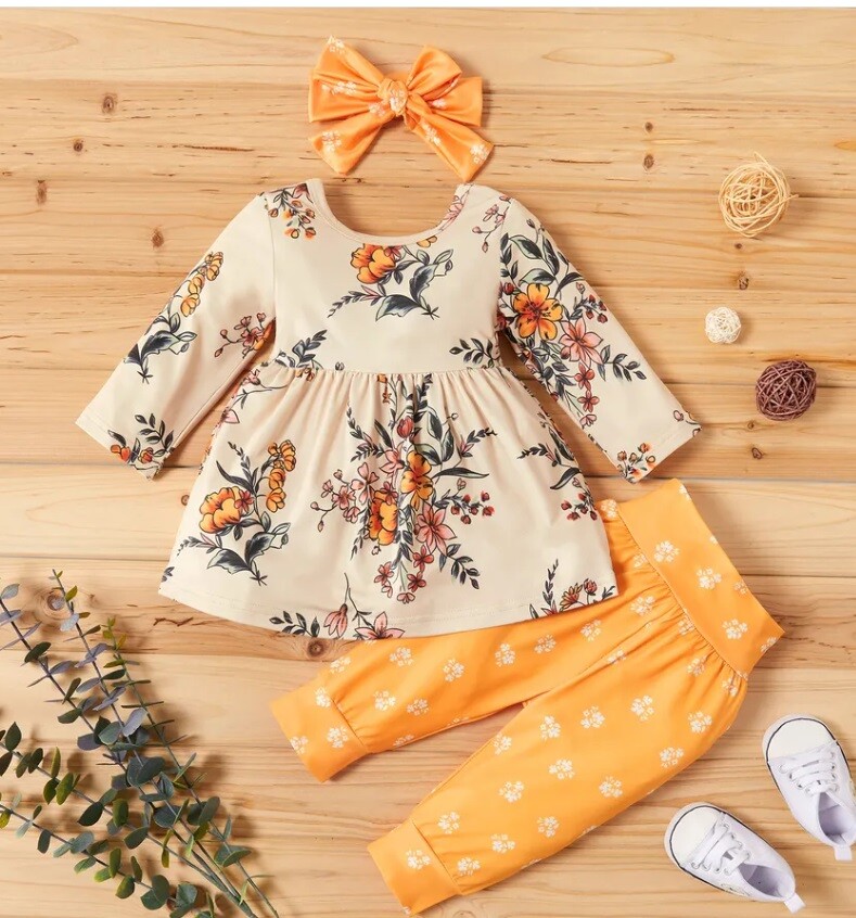 New girls 3 piece outfit yellow floral long top, pants and headband set - please select size