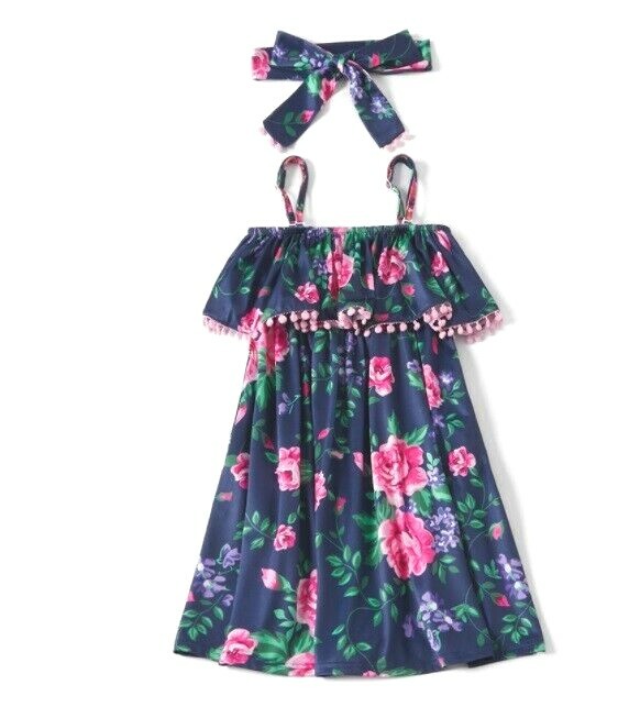 NEW Size 2 years Dark Blue Pink Floral Pom Pom Trim Ruffle Dress & Headband Set