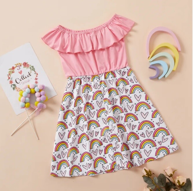 Girls Dress- Rainbow and Heart Print Pink Off-Shoulder Girls Dress