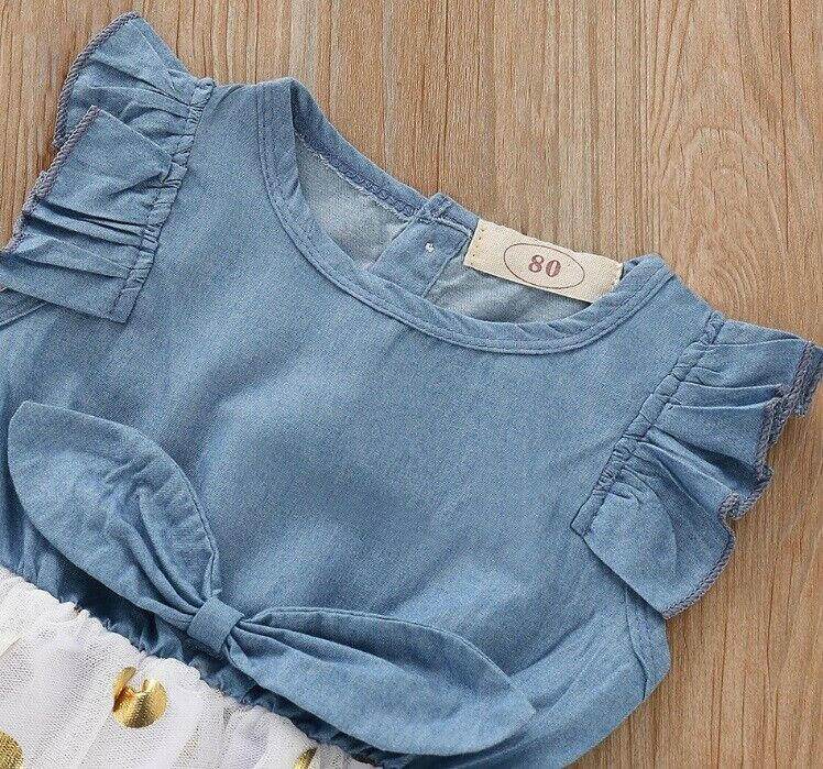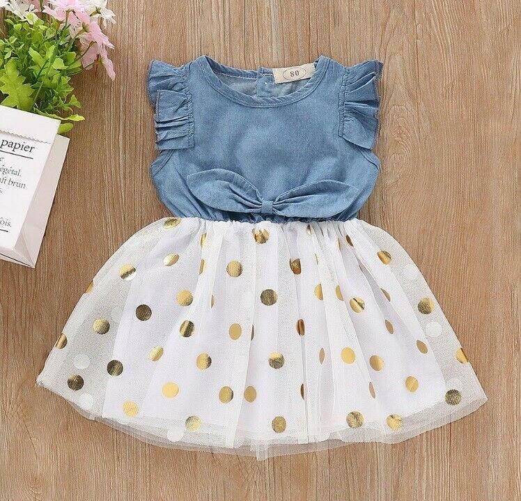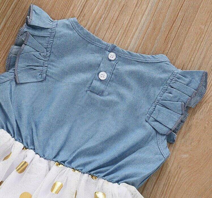 Girls dress size 12-18 months blue chambray gold polka dot tulle girls dress