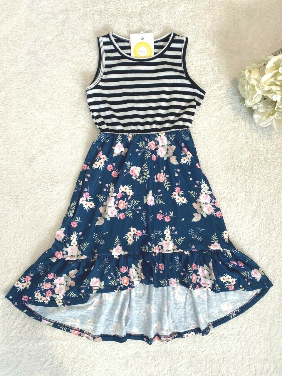 NEW Size 3-4 Years Girls Dress Cute Navy Blue Stripe & Floral High Low Dress .