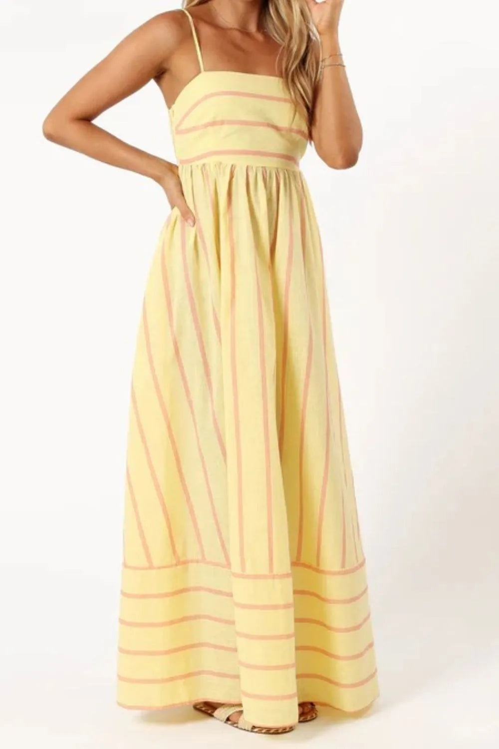 Perfect for sunny days and warm evenings, this striped maxi dress combines timeless style with modern details. The elegant square neckline and delicate cami straps create a flattering silhouette, while the flowing midi length ensures comfort and effortless movement.