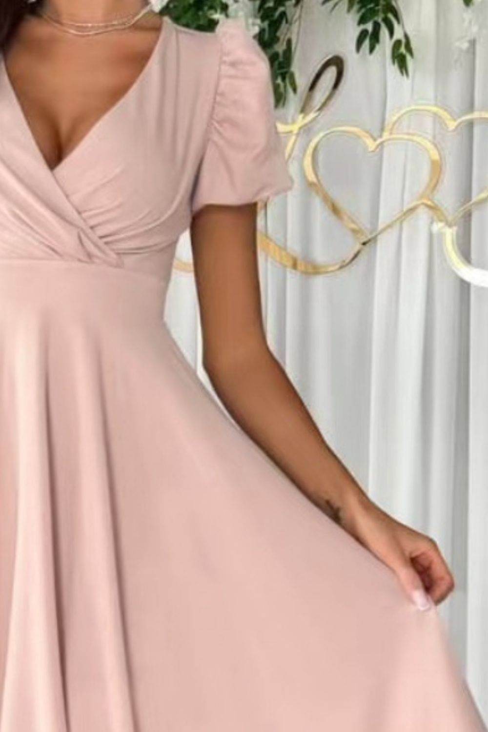 This elegant midi dress features a flattering surplice neckline and chic puff sleeves, creating a sophisticated and timeless silhouette perfect for any special occasion.
