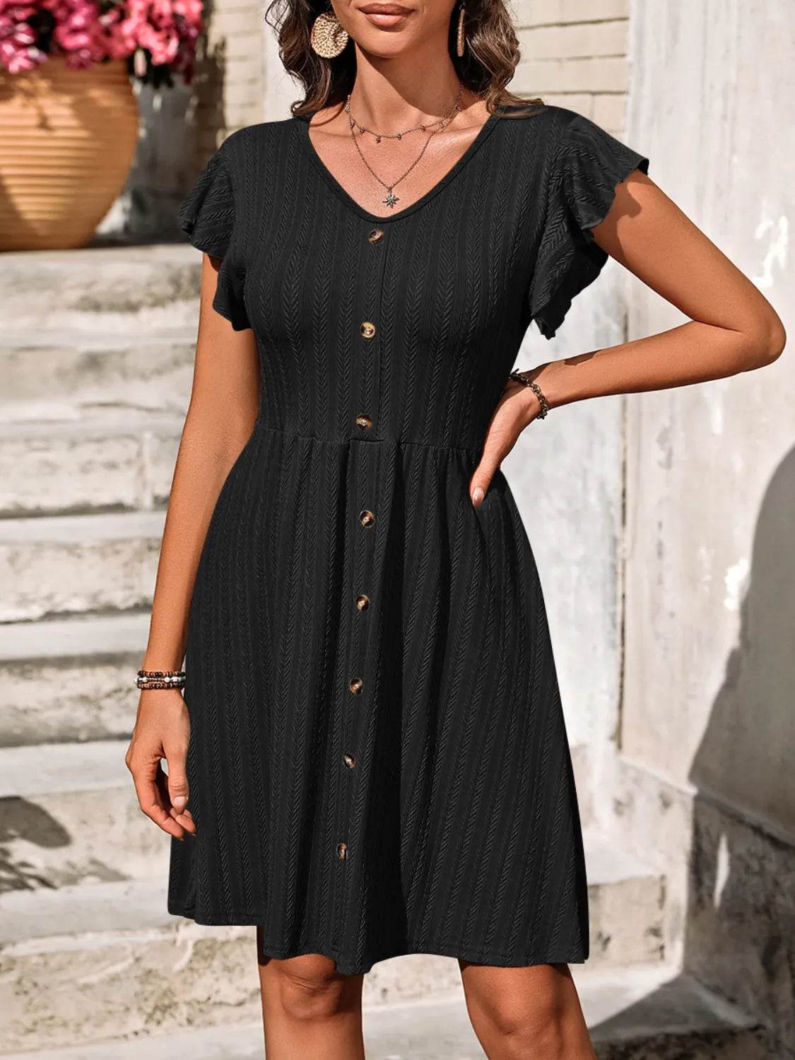 Comfortable and feminine casual dress featuring a flattering V-neckline and sweet ruffled cap sleeves. Perfect for casual wear.